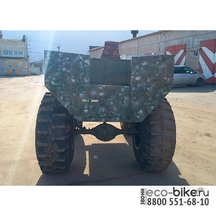 Вездеход Переломка Мужик на шинах низкого давления - это компактная модель караката на колесах. Вездеход имеет высокий кузов, способен вместить до 9 человек. Установлен двигатель 20 л.с. с электрозапуском, глушитель (выведен вниз), имеется генератор. Мягкое сидение дает дополнительную амортизацию. Средние размеры позволяют разместить его даже в Газели. 2 фары по 27 Вт хорошо освещают дорогу в темное время суток. Так же есть площадка под лебедку.